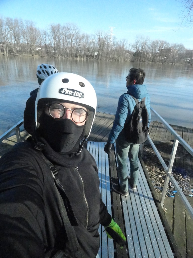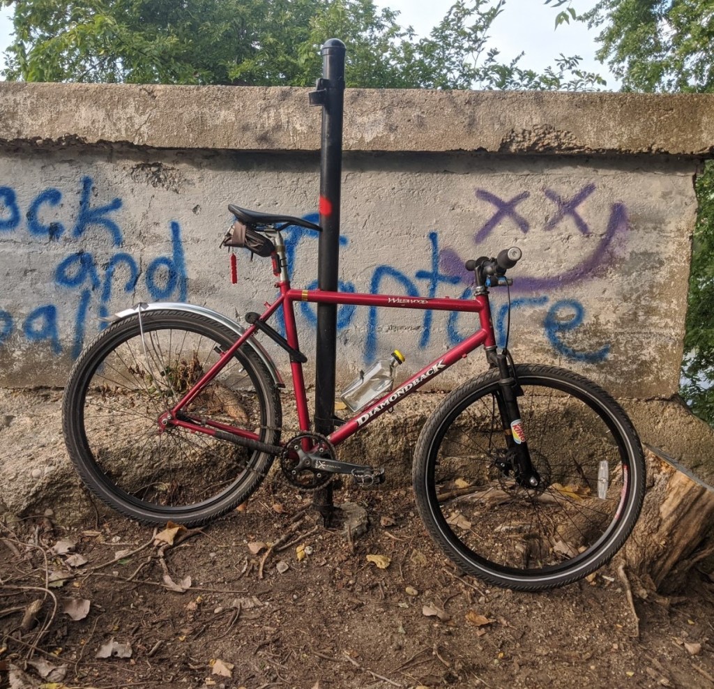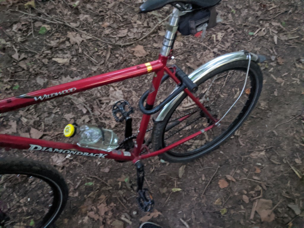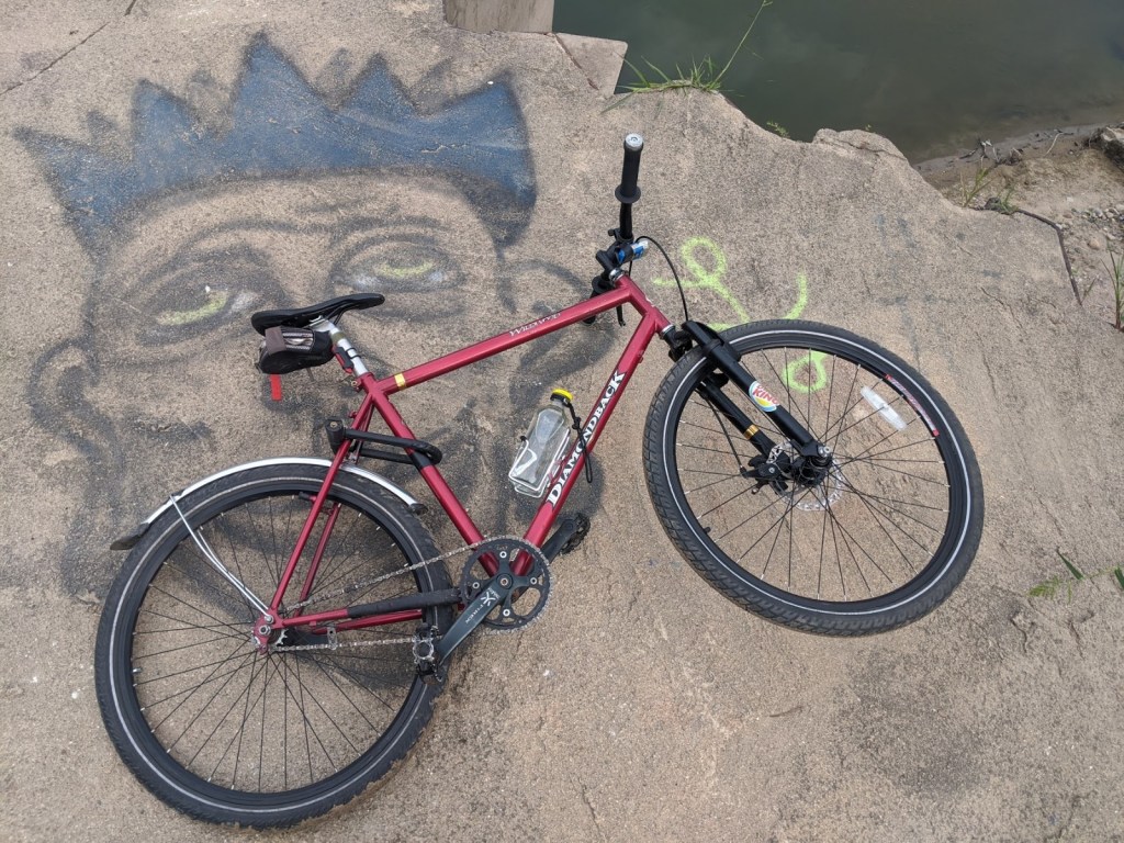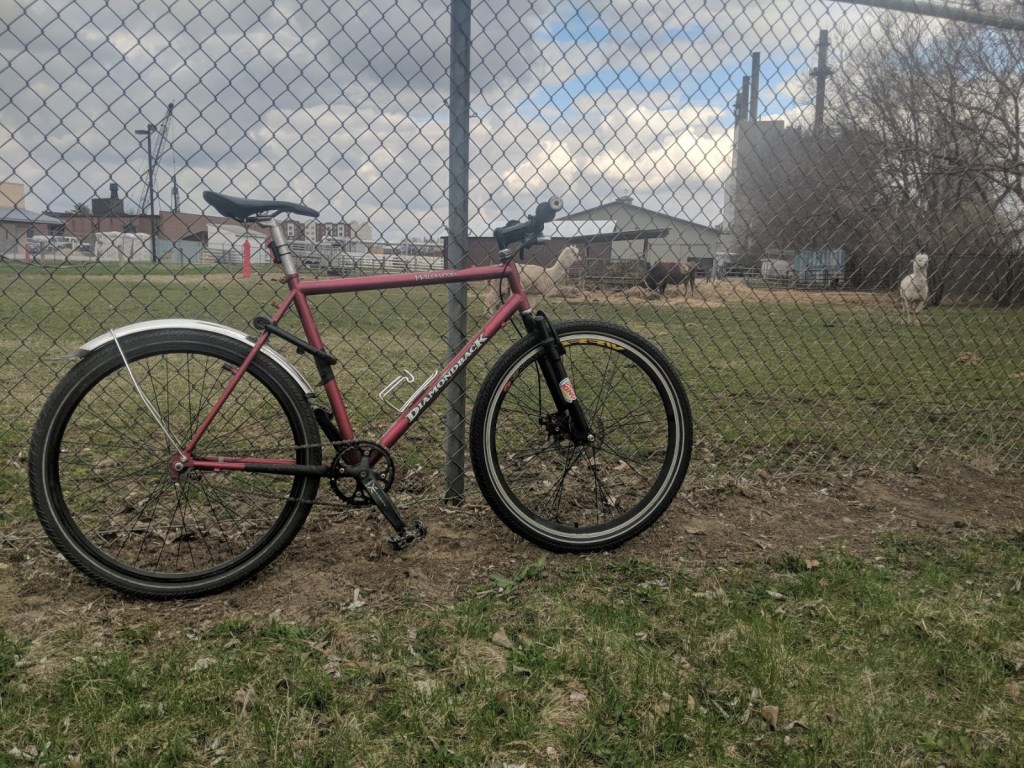 This was the second real iteration of this bike. With spring came a new, much less knobby pair of tires and some new handle bars. The biggest new addition was the front fork. I took apart two different suspension forks with 1″ steerer tubes, took the springs out, and slammed them together, just so I could have front disc brakes on a rigid fork. Its a quite heavy and janky addition, but the reliable and strong stopping power is worth it. Winter’s rear fender was kept, as I had quickly seen the value of a dry butt. The new handlebars, slicker and slimmer tires, and eventual new stem made this iteration feel a lot more sporty while keeping the reliable heft and solid construction from the first iteration
