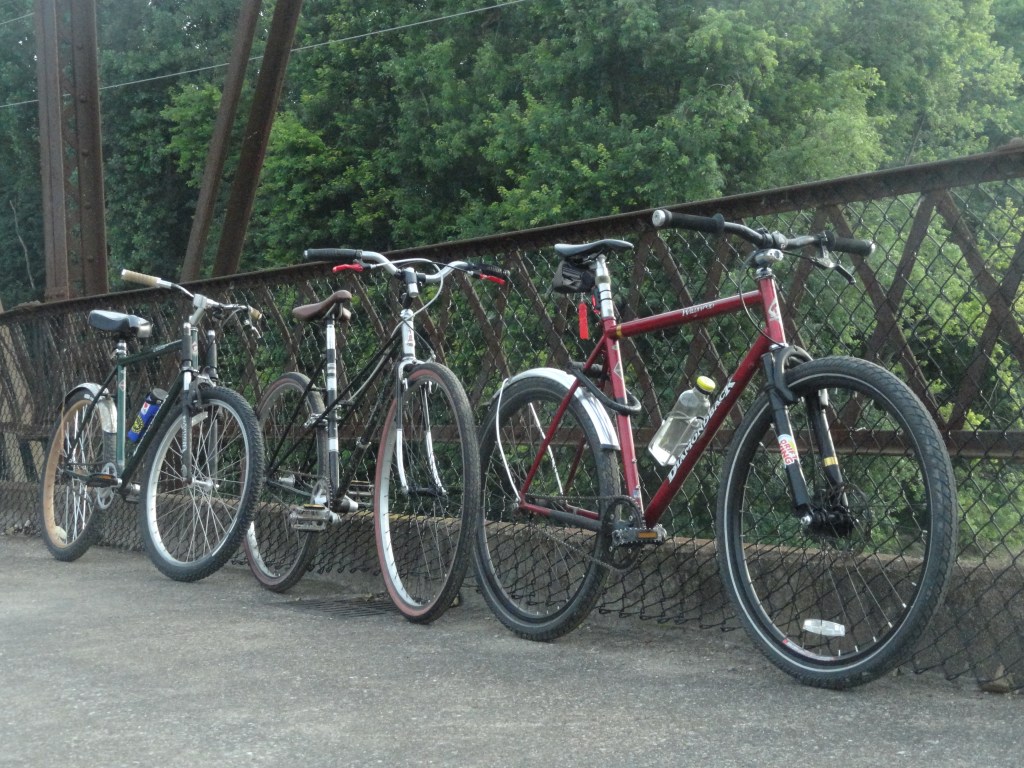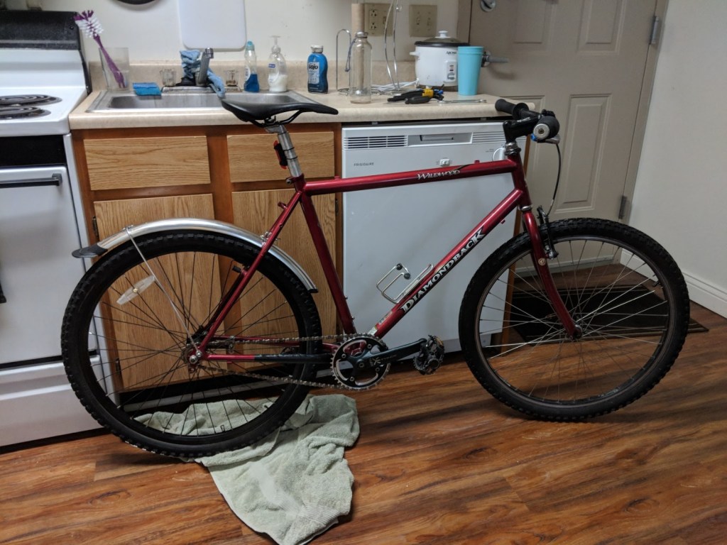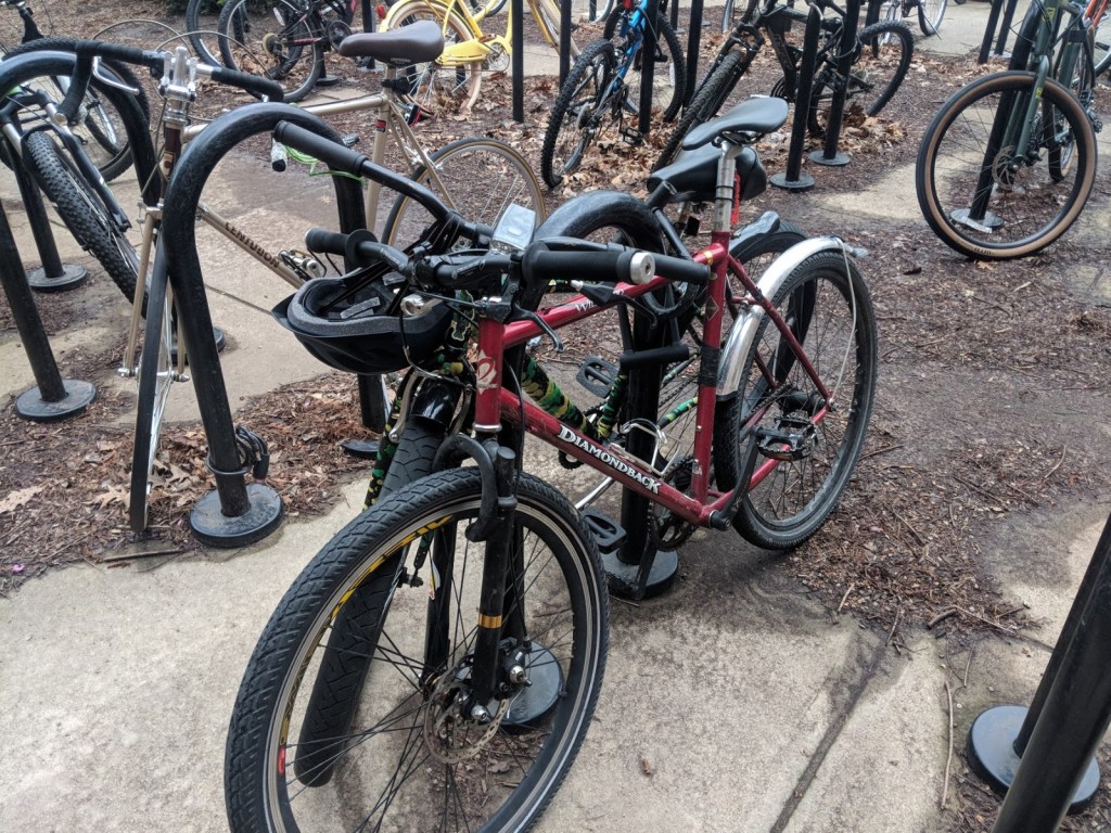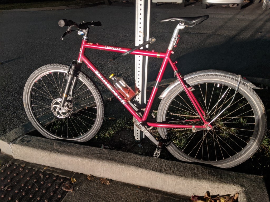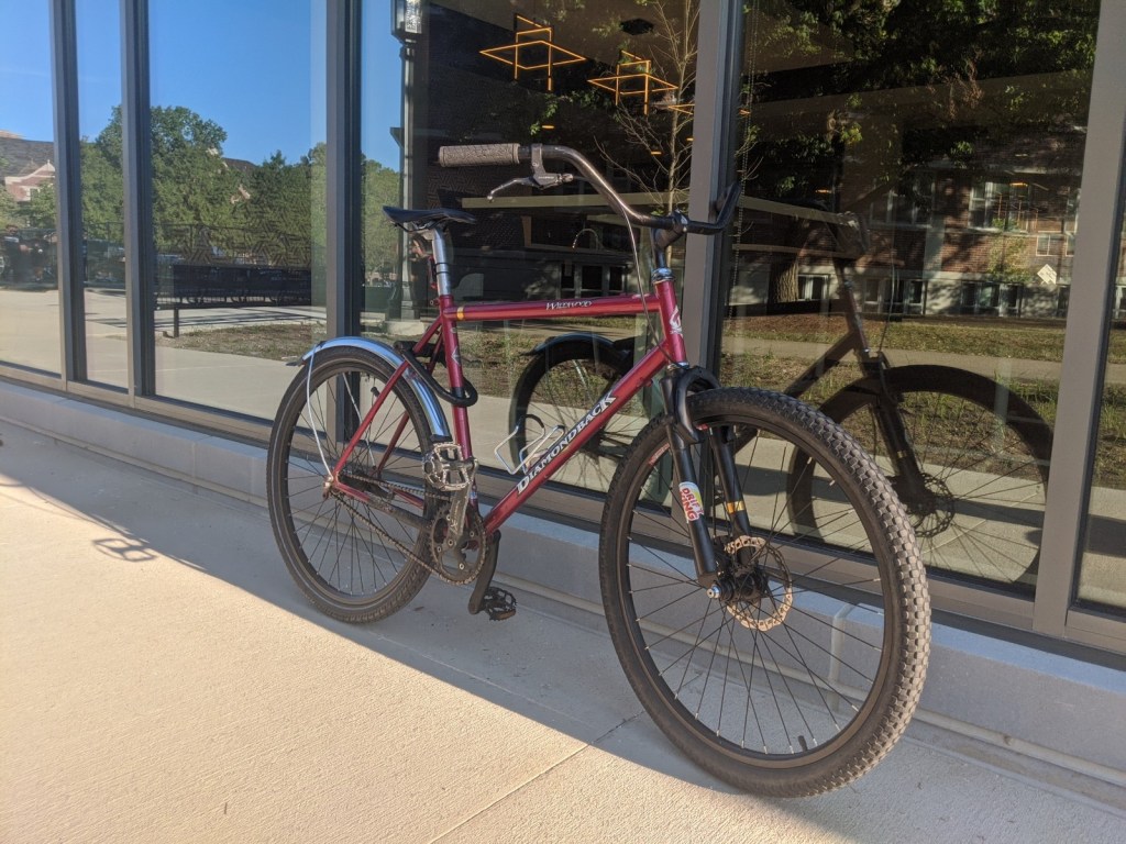 It is my “main bike.” The one I use to commute to class, go on rides with friends, pick up something small from the shop. It can go almost anywhere at decent speeds, with no suspension but larger tires and a tough chromoly frame. It started life as a 1998 Diamondback Wildwood, but is now far from stock. It sports a sleazily fabricated front fork to mount a disc brake on the front and a coaster brake for single speed simplicity on the rear. This bike changes with the seasons and with me. Snow, sunshine, or just the need to pedal from my fears, this bike has me covered.