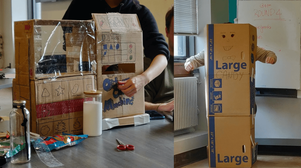 From this point one, we tried to focus on 4 main concepts that brought candy to the customer, and physically prototype all 4 of them during one sprint. However, due to Purdue’s response to the Corona Virus and the movement of classes online, we decided to cut the prototyping short (we had accomplished 2 prototypes at this time) and focus on the machine that we thought had the most potential; the Candy Vending Machine.