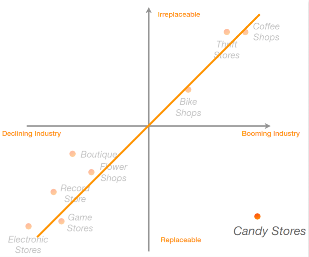 To start scoping we look at what the team was interested to make sure we had a project every team member was engaged with and have fun with. This was something that was always important when working with Avanade, the passion that comes from having fun and how that improves your design process. From here we narrowed to down to retail, and then further to local retail stores. We then made a graph of which of these stores was most easily replaced by big box substitutes, and how well these stores were performing business. ONe that stood out was Candy Shops, and the team agreed that working with candy sounded like a great idea.