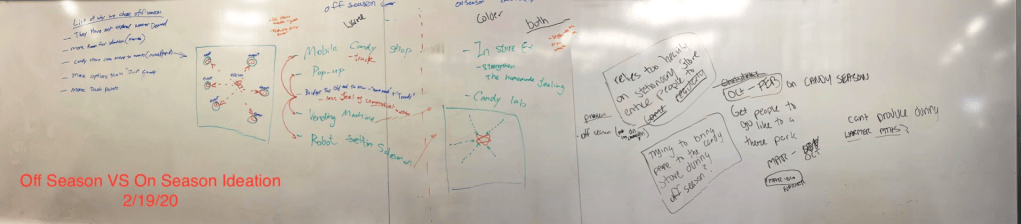 For ideation, were first needed to further narrow down to what exact problem we wanted to help the Candy Stores face. Through many discussions and 3 rounds of group sketching we decided to focus on the stores’ off-season, and create experiences to help them sell candy during this time.