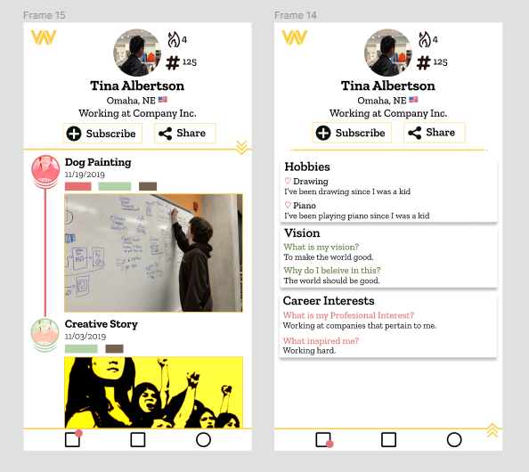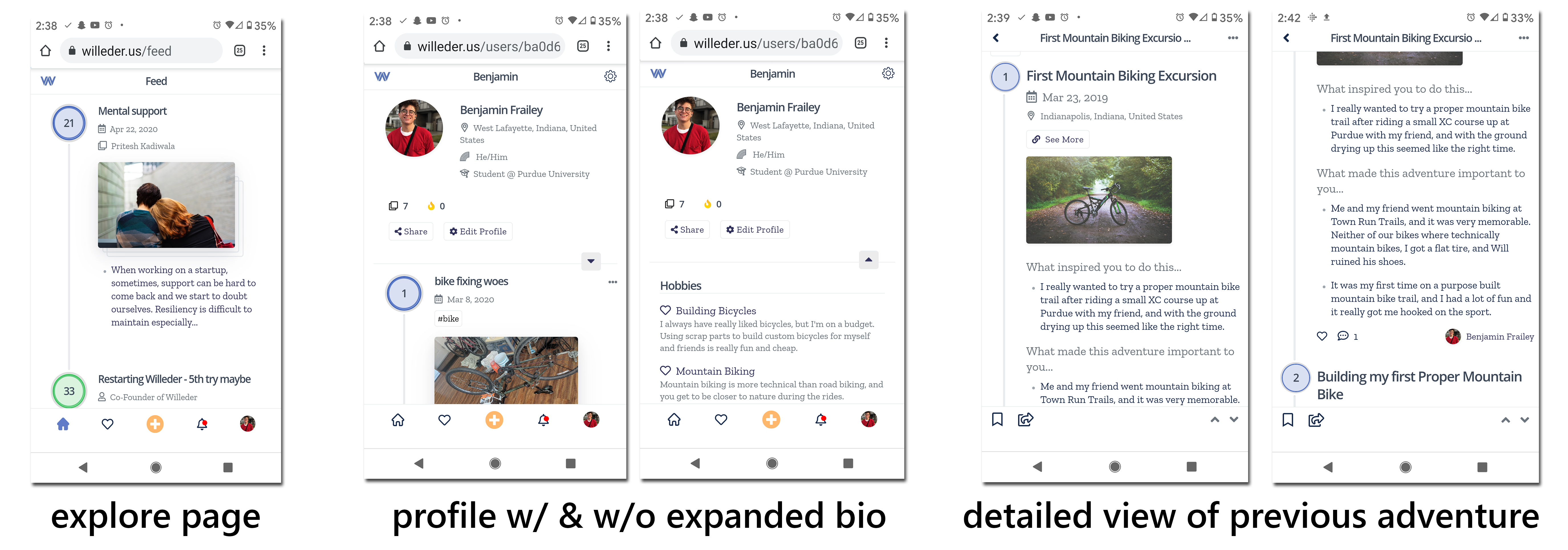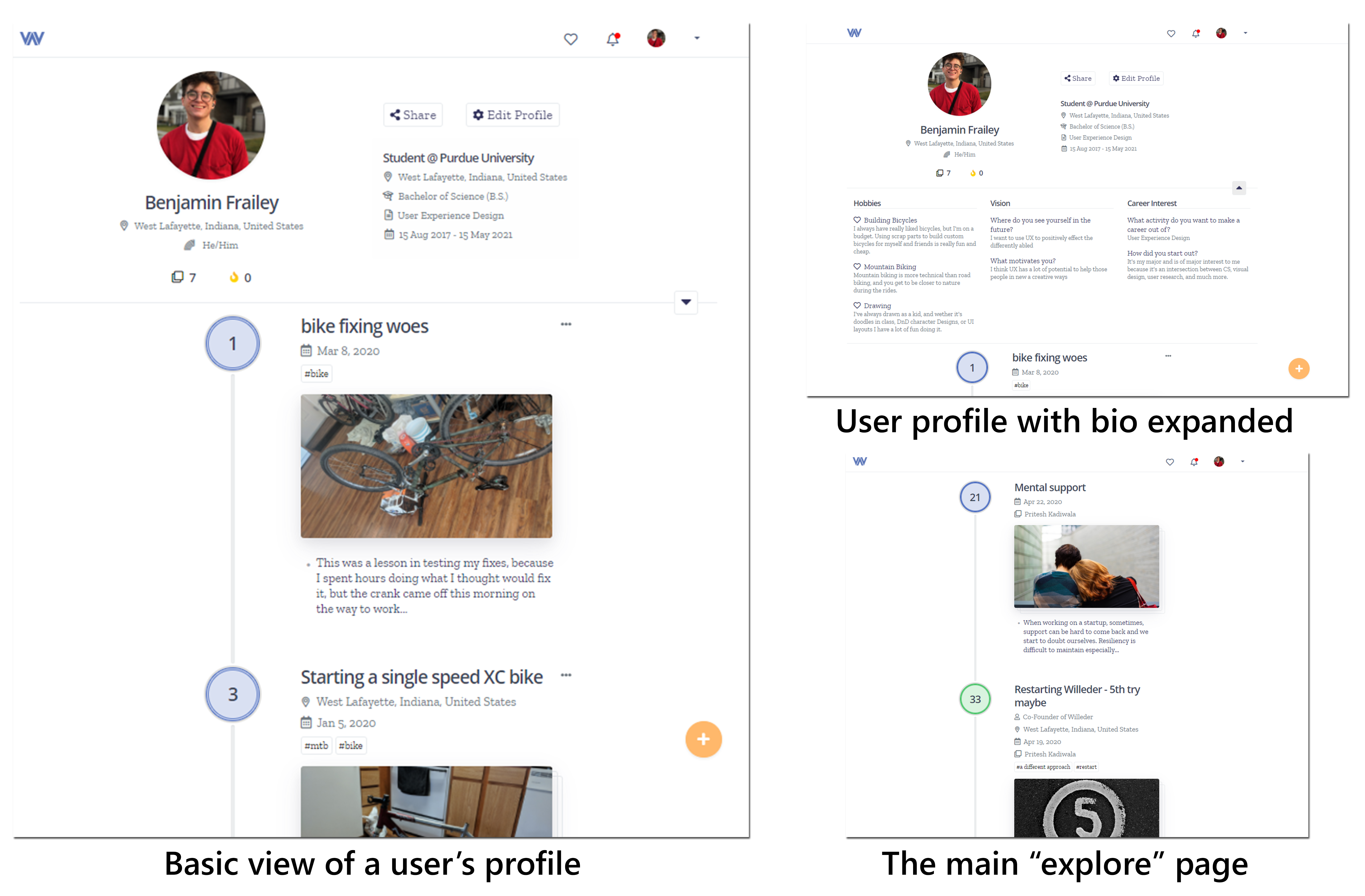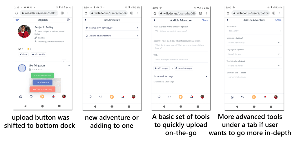 Willeder is aiming to let people post and communicate about their projects, accomplishments, and challenges in a close knit community. This is accomplished by created a profile that does not revolve along likes, or grandiose posts, but instead small steps that add up to separate adventures that come all together to create a person’s story. To emphasis this, the posts are connected to each other and displayed in a chronological timeline.