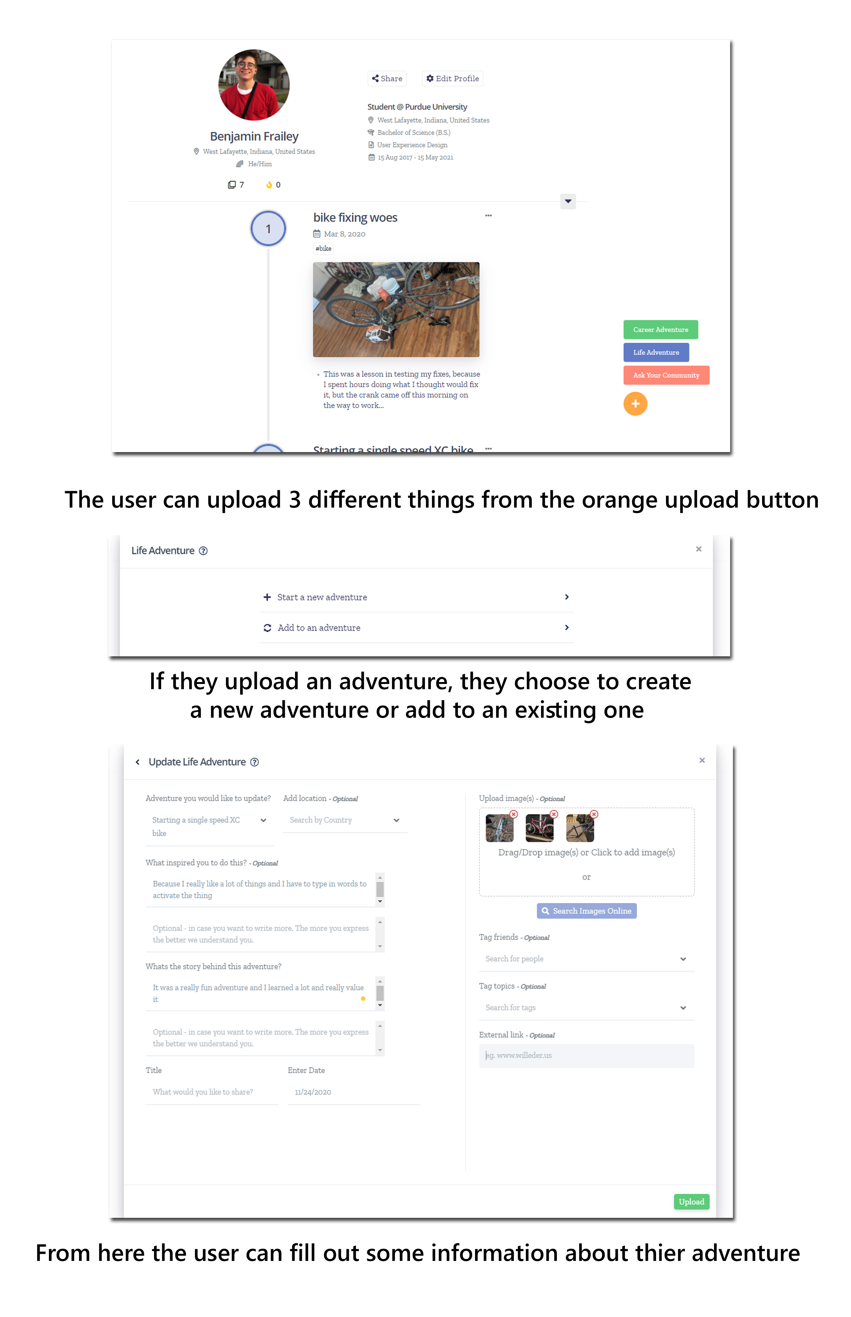 This version of uploading was very different than the desktop version because we found through research that users would upload different things on mobile than they did on desktop, so we tweaked it to fit the quicker adventures mobile users would upload.